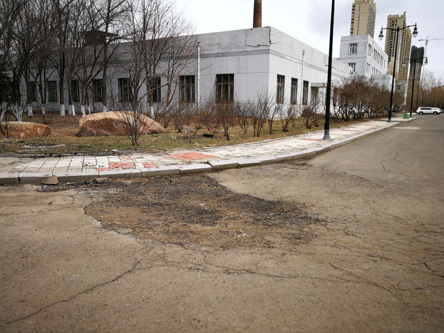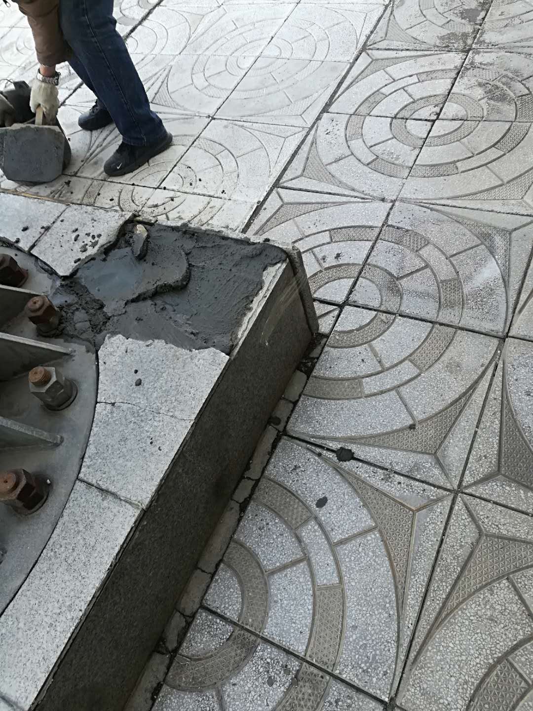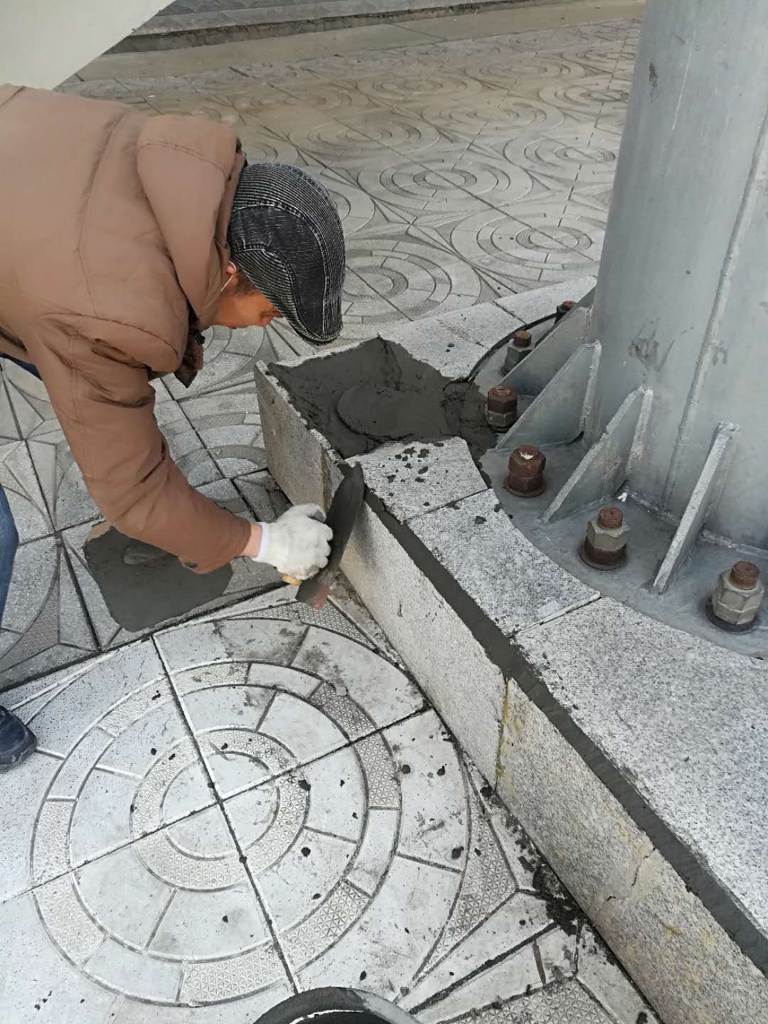 4月11日,房产修缮师傅为A 区体育场步行街理石板进行修补