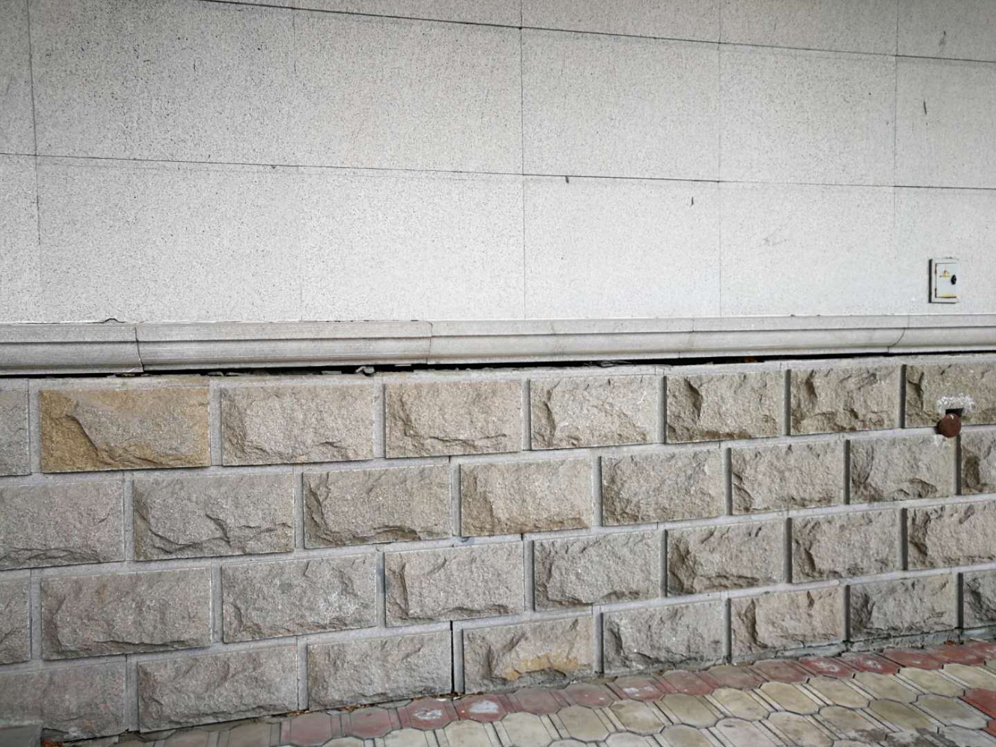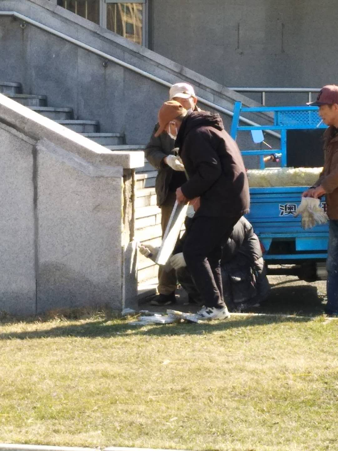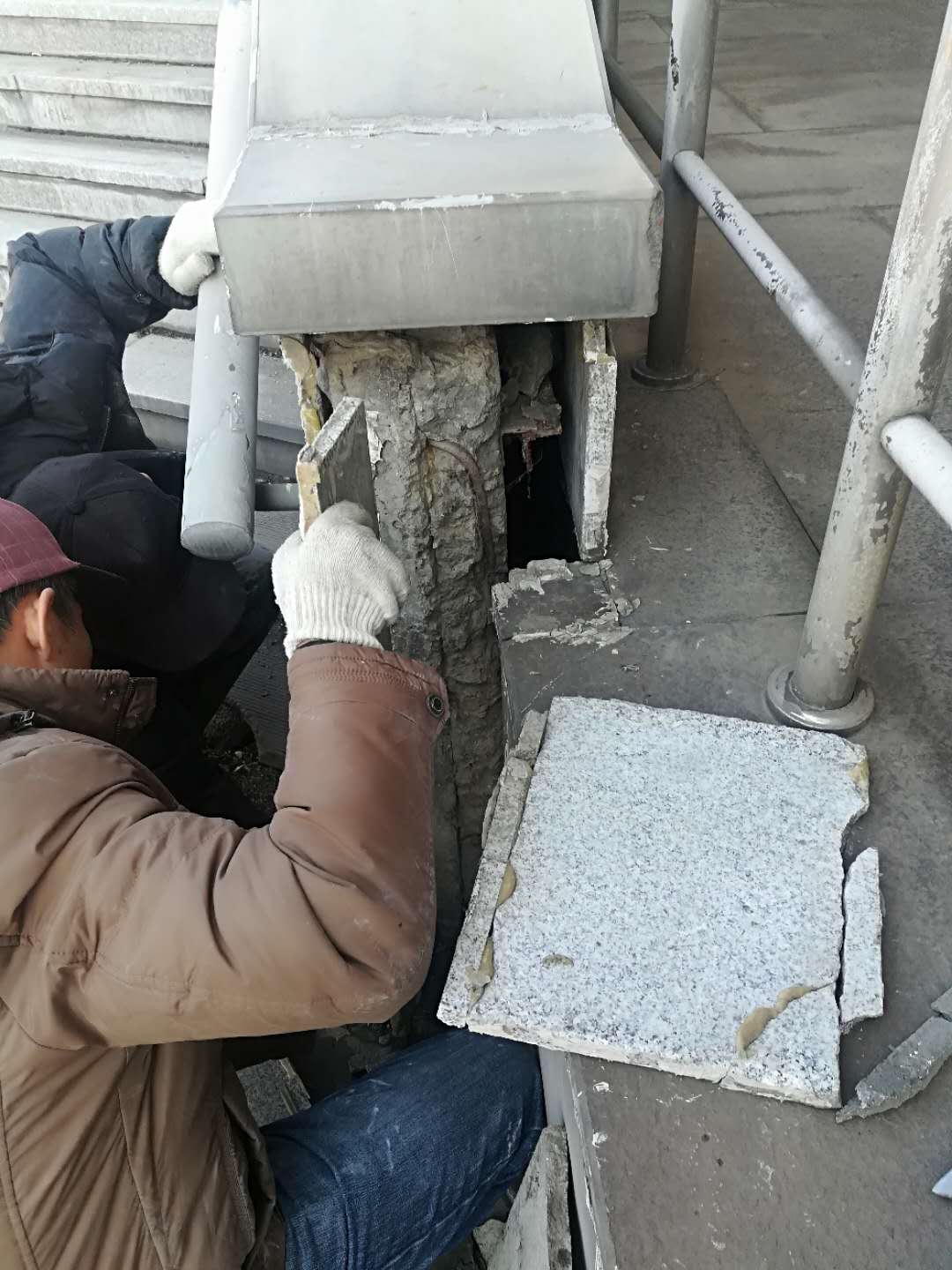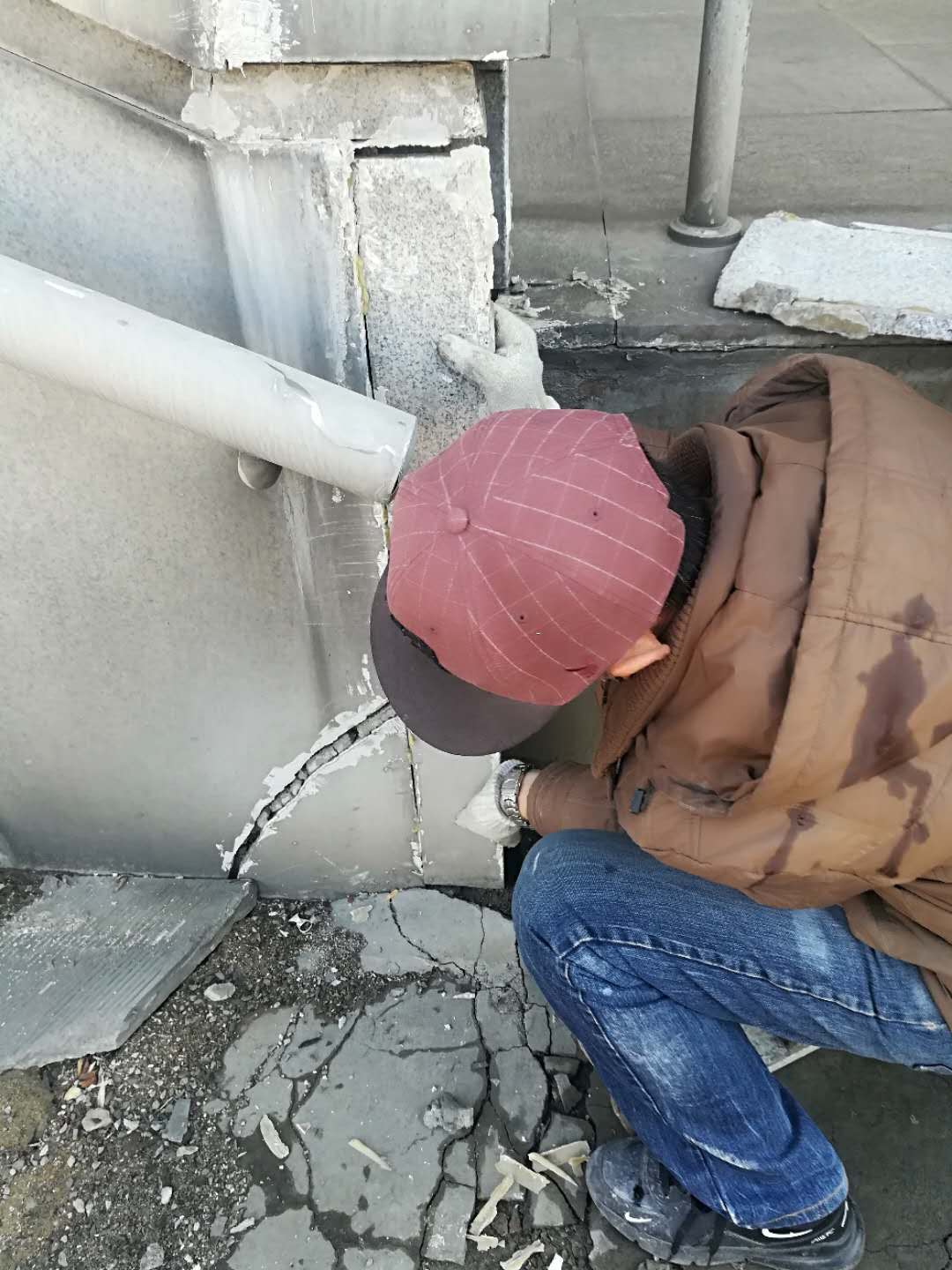 4月10日,房产修缮师傅为A区体育馆外侧楼梯理石墙板进行修补