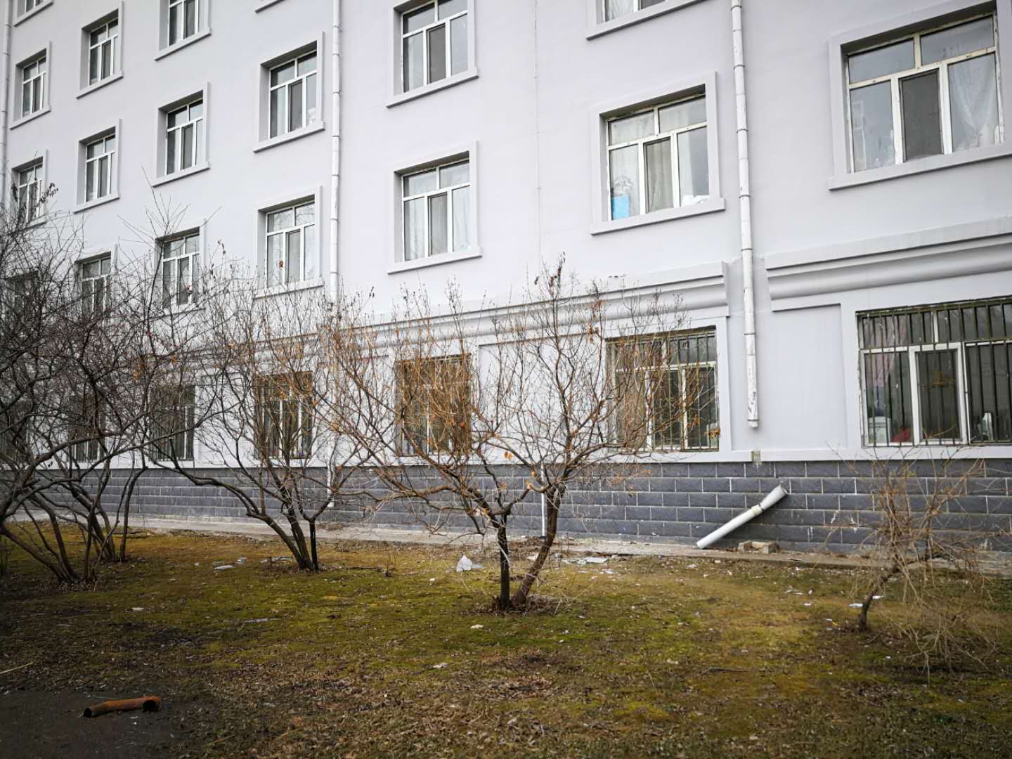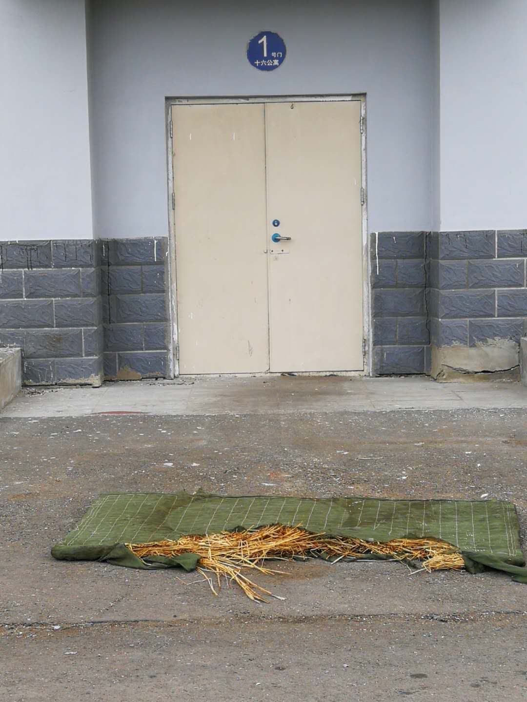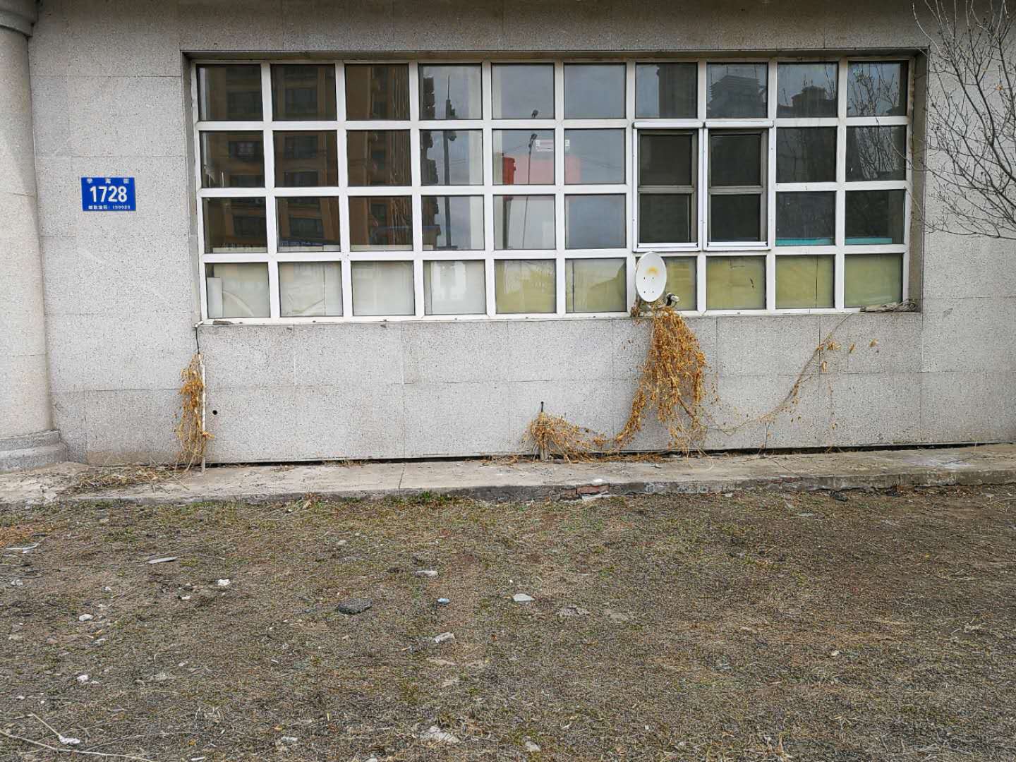 4月10日,房产修缮师傅为A区体育馆外侧楼梯理石墙板进行修补