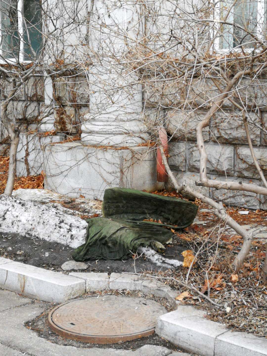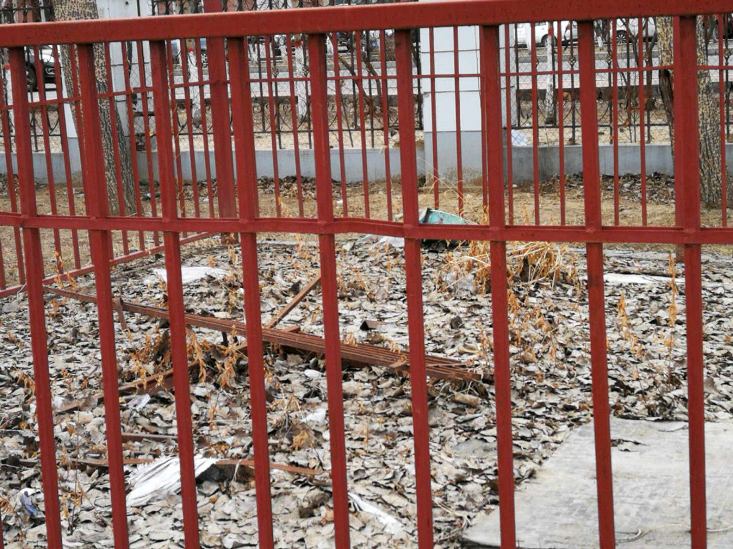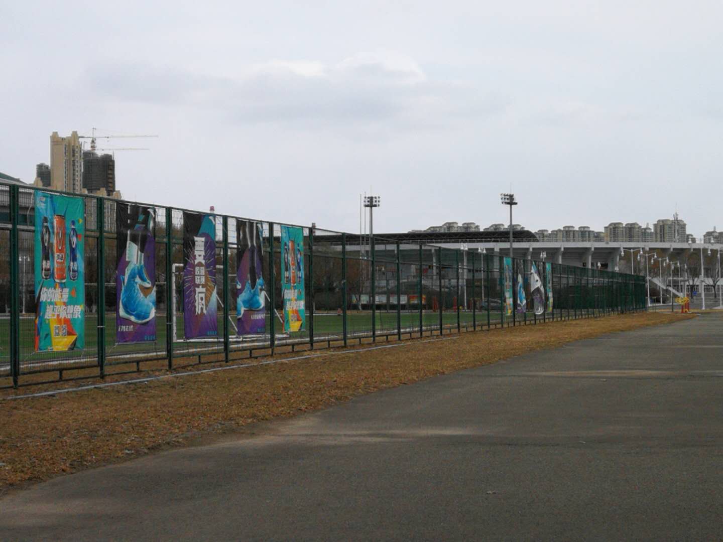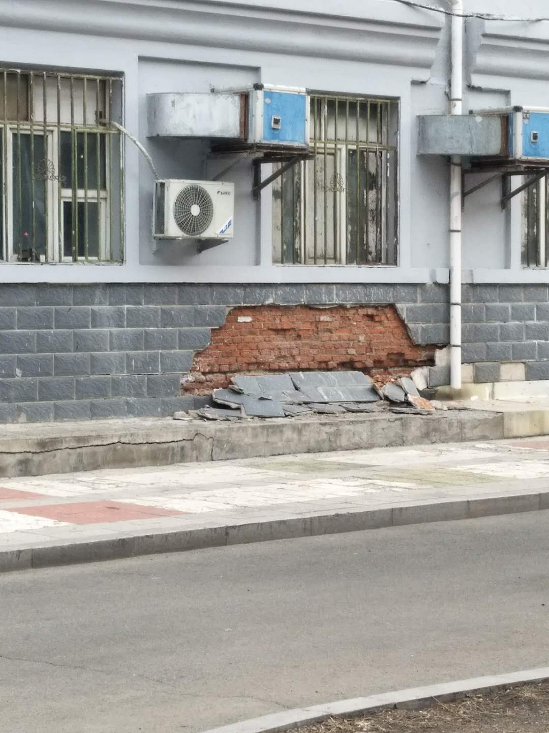 4月10日,房产修缮师傅为A区体育馆外侧楼梯理石墙板进行修补