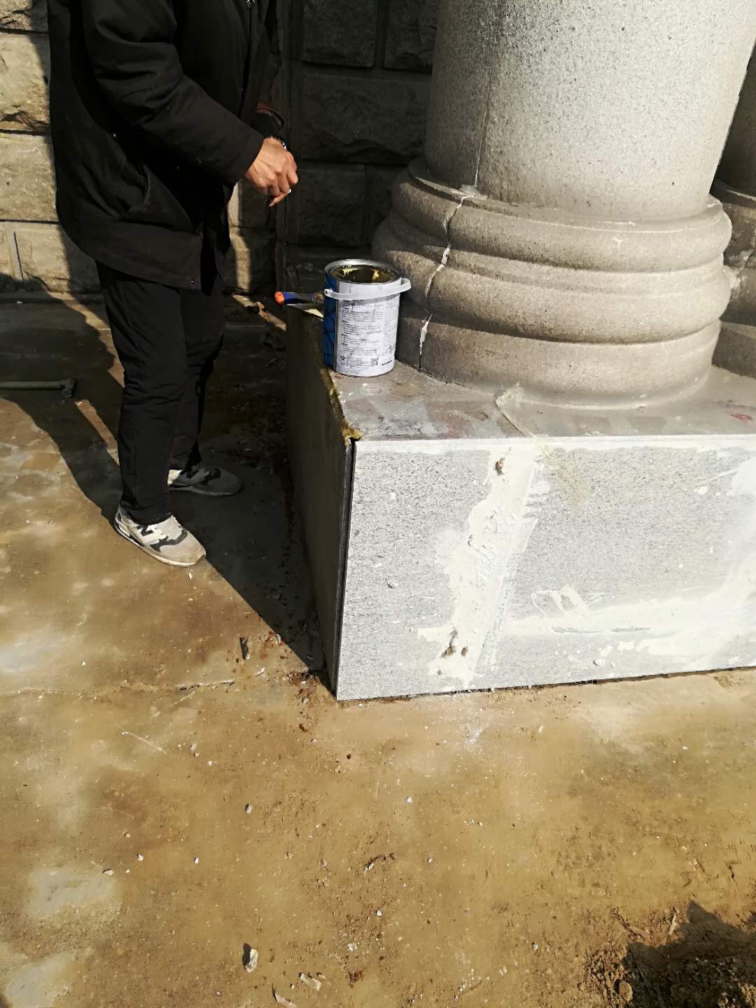 4月9日,房产修缮师傅为A区4号楼门前大理石板进行修补