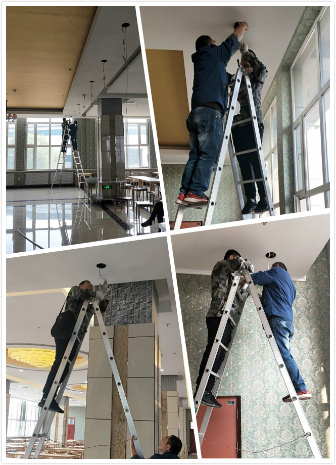 电工师傅,抢修食堂短路灯具,让明亮留在食堂里,留在学生心中。