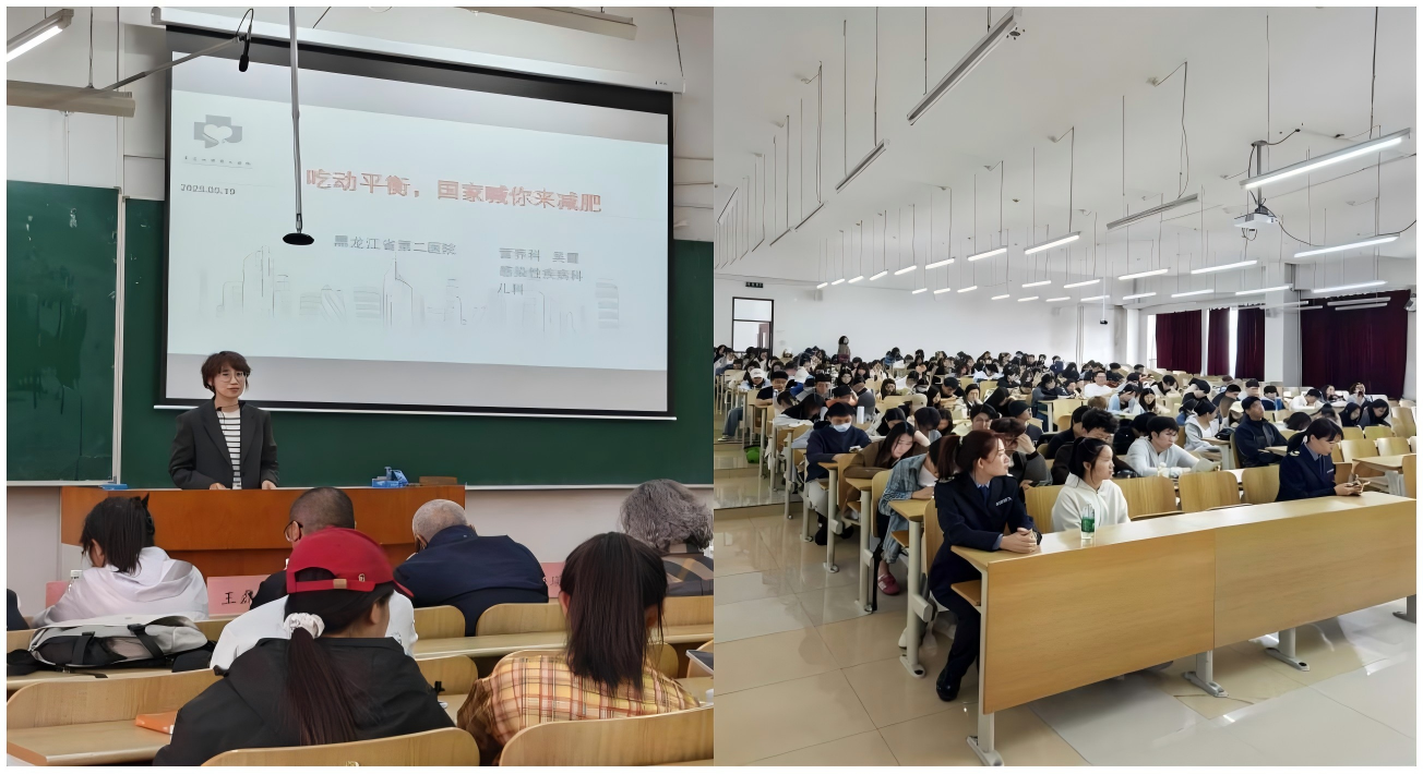 紧接着,来自黑龙江省第二医院营养科的专家,在卫健委的邀请下,开启了营养膳食与体重管理的科普培训。专家摒弃晦涩难懂的专业术语,以通俗易懂的语言结合生动鲜活的案例,将“吃动平衡” 的核心概念娓娓道来。从人体所需的各类营养元素,到不同食物的热量构成,再到运动与饮食的协同作用,每一个知识点都剖析得细致入微。同时,专家反复提醒学生们,想要保持健康体重,合理膳食、适量运动、规律作息三者缺一不可,引导大家树立正确的合理膳食理念,养成良好的饮食习惯,切实提高自身的营养健康素养。