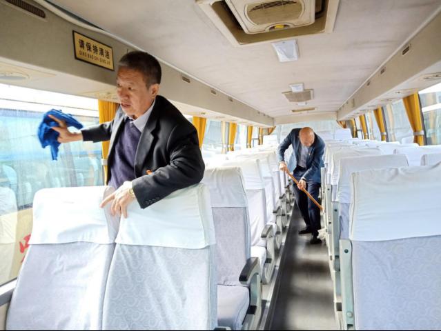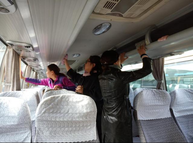 12点30分,B区车库门前,一派热火朝天的劳动场面。党员纷纷拿起了拖布、抹布,走入通勤车内,对驾驶台、地板、窗玻璃及行李架进行了细致擦拭、清洗、除尘,认真铺平座套,大家积极主动、热情高涨,经过三十分钟左右的时间,所有的通勤车擦拭得焕然一新。