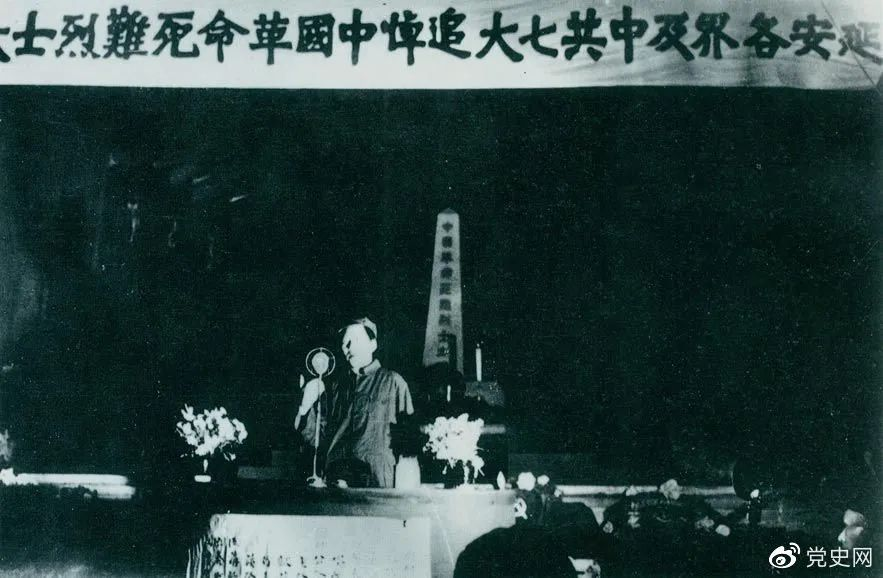 1945年6月17日,中共七大代表及延安各界代表在中央党校大礼堂,举行中国革命死难烈士追悼大会。