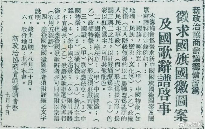 1949年7月10日,新政治协商会议筹备会决定公开向全国征集国旗、国徽图案和国歌词谱。图为《人民日报》刊登的征集启事。